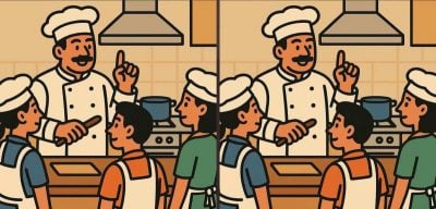 คุณพร้อมสำหรับความท้าทายต่อไปแล้วหรือยัง? ชมภาพสองภาพของเชฟที่กำลังสอนทำอาหารในครัวอย่างใกล้ชิด เมื่อมองแวบแรก ภาพเหล่านี้อาจดูเหมือนกัน แต่ถ้าคุณเจาะลึกลงไปอีก คุณจะสังเกตเห็นความแตกต่างเล็กๆ น้อยๆ 3 ประการที่ซ่อนอยู่ในภาพอย่างชาญฉลาด คุณสามารถค้นหาพวกมันทั้งหมดได้ในเวลาเพียง 19 วินาทีใช่ไหม?