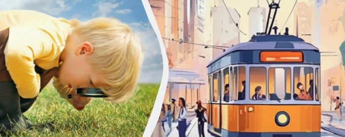 ภาพแสดงถนนที่พลุกพล่านซึ่งมีผู้คนเดินไปมาและมีรถรางวิ่งเป็นประจำ คุณต้องตั้งเวลาไว้ห้าวินาทีและค้นหาข้อบกพร่องก่อนที่เวลาจะหมด คุณพร้อมหรือยัง?