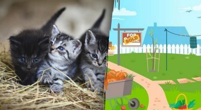 คำตอบที่ถูกต้อง. แมวตัวหนึ่งซ่อนตัวอยู่ในรถสาลี่ ตัวที่สองกำลังดมดอกไม้ และตัวที่สามกำลังวางอยู่บนเก้าอี้