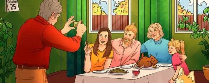 ในภาพถัดไป เราเห็นครอบครัวกำลังถ่ายรูปที่โต๊ะวันขอบคุณพระเจ้า ความจริงที่ว่าญาติเฉลิมฉลองวันขอบคุณพระเจ้านั้นระบุโดยไก่งวงแบบดั้งเดิมสำหรับวันหยุดนี้ซึ่งเราเห็นบนโต๊ะ